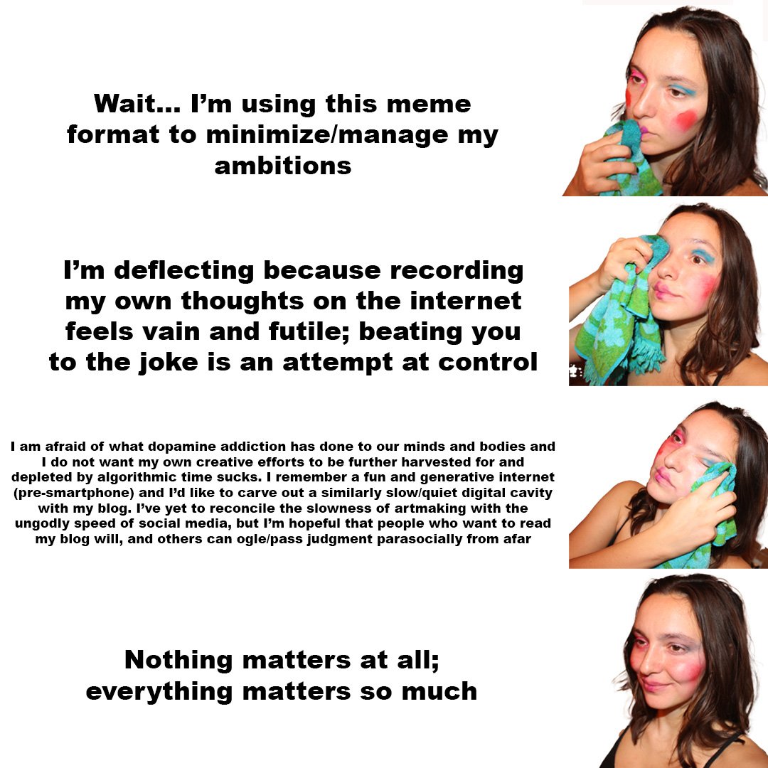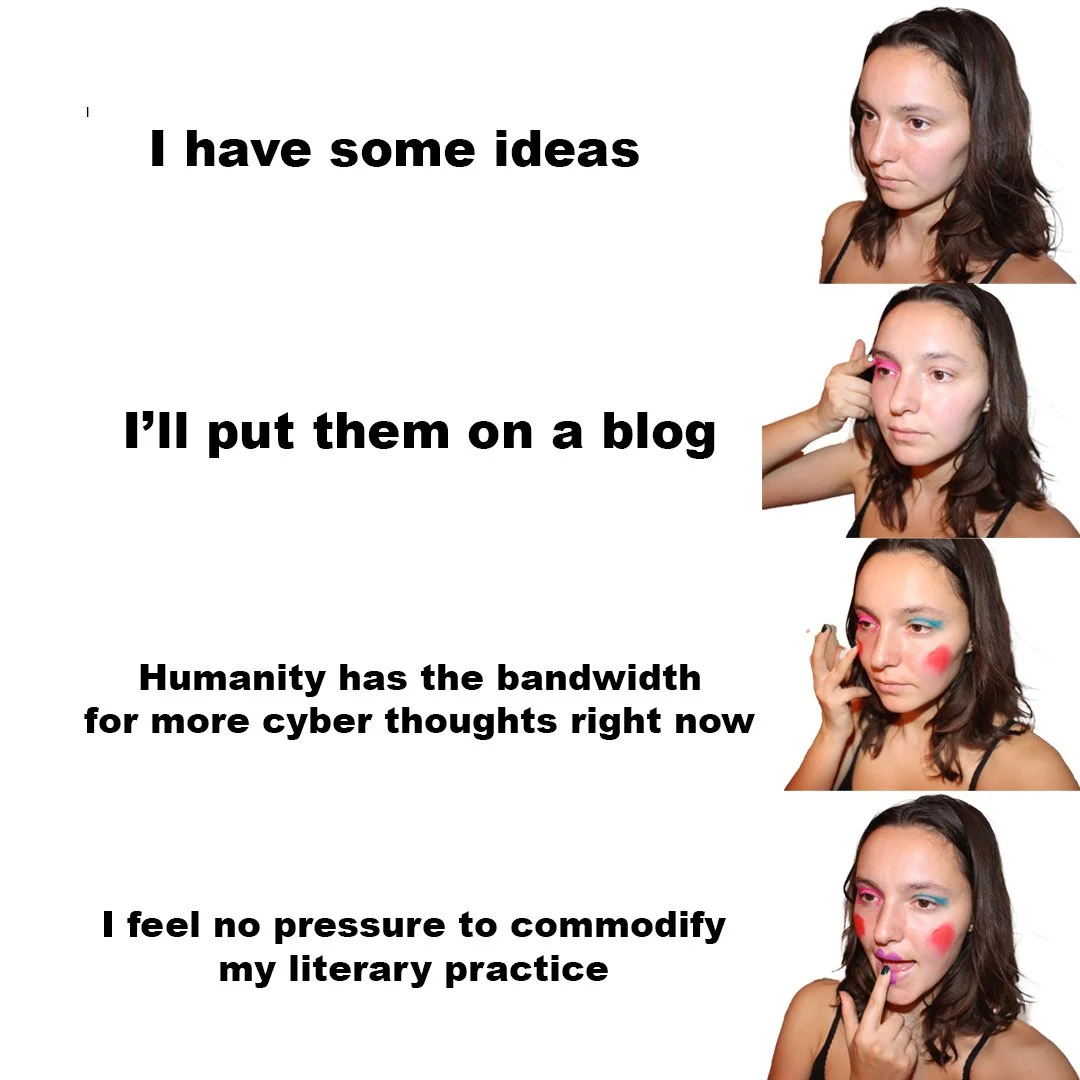 So I scrapped the blog entirely. I could not bear to be misinterpreted or disliked. I could not accept my own clownish fears and impulses, made bald by Squarespace formatting. And I could not reconcile the warp speed of the internet, either. I could not produce at the pace Atomic Habits had instructed, eking out timely hot takes and cajoling my audience’s sustained, parasocial attention.